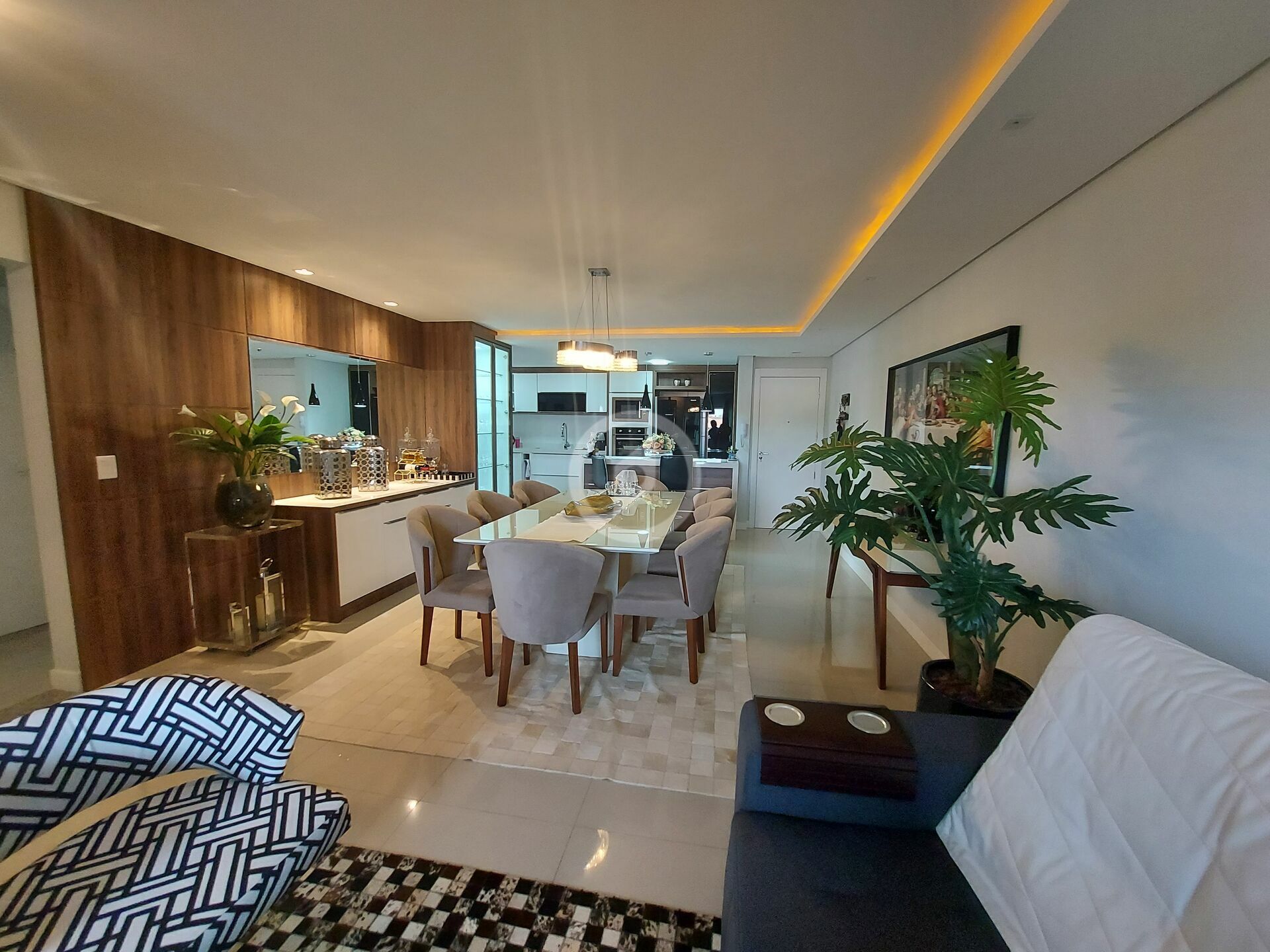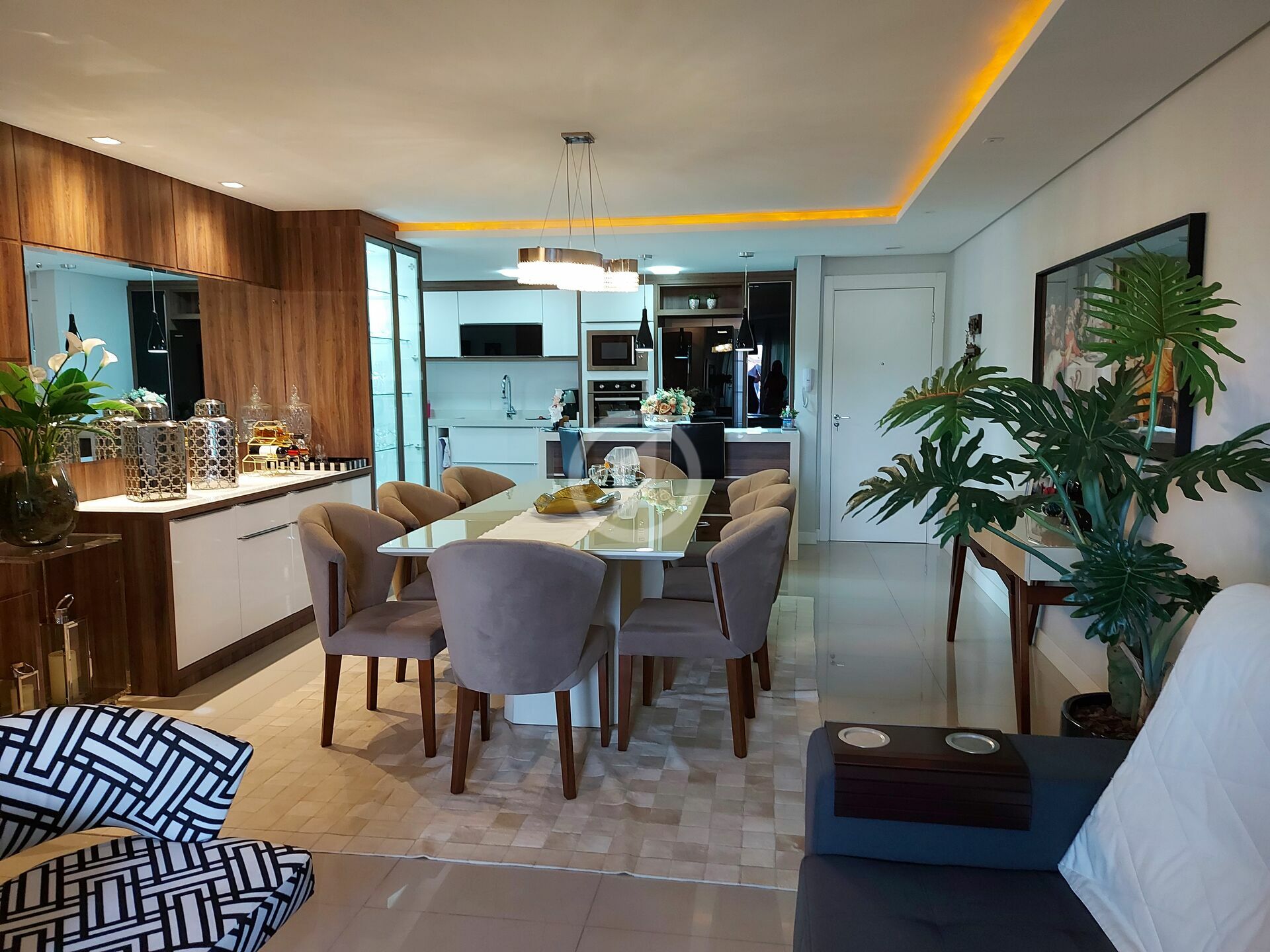 Fica todos móveis planejados, mesa, sofá, luminárias.